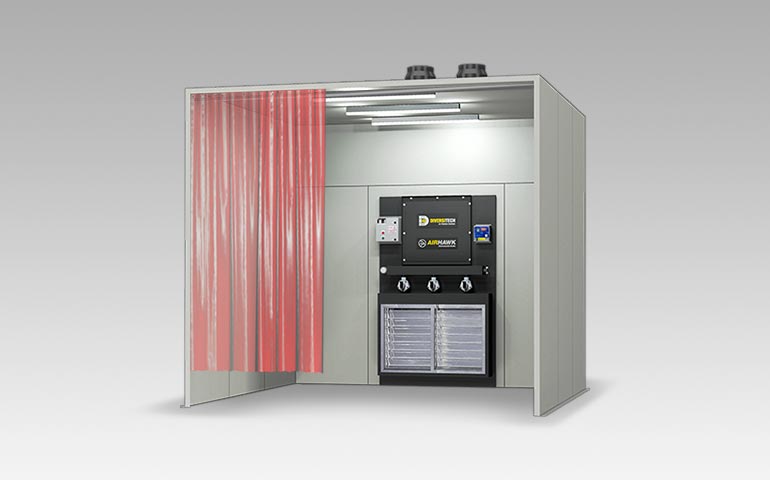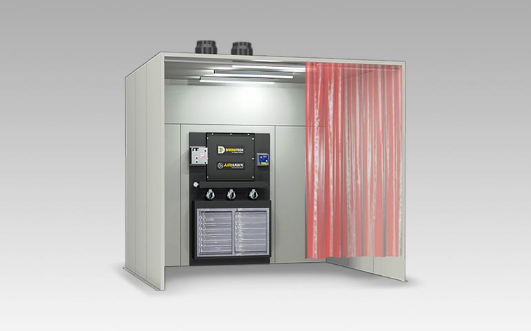 With 4, 6 or 8-cartridge options ranging from 3000 CFM to 6000 CFM, the Airhawk Environmental Booth Modules (EBMs) serve as the booth’s filtration unit. Once installed, the booth draws smoke, dust, and fumes, into its louvered inlet and away from the operator’s breathing zone.