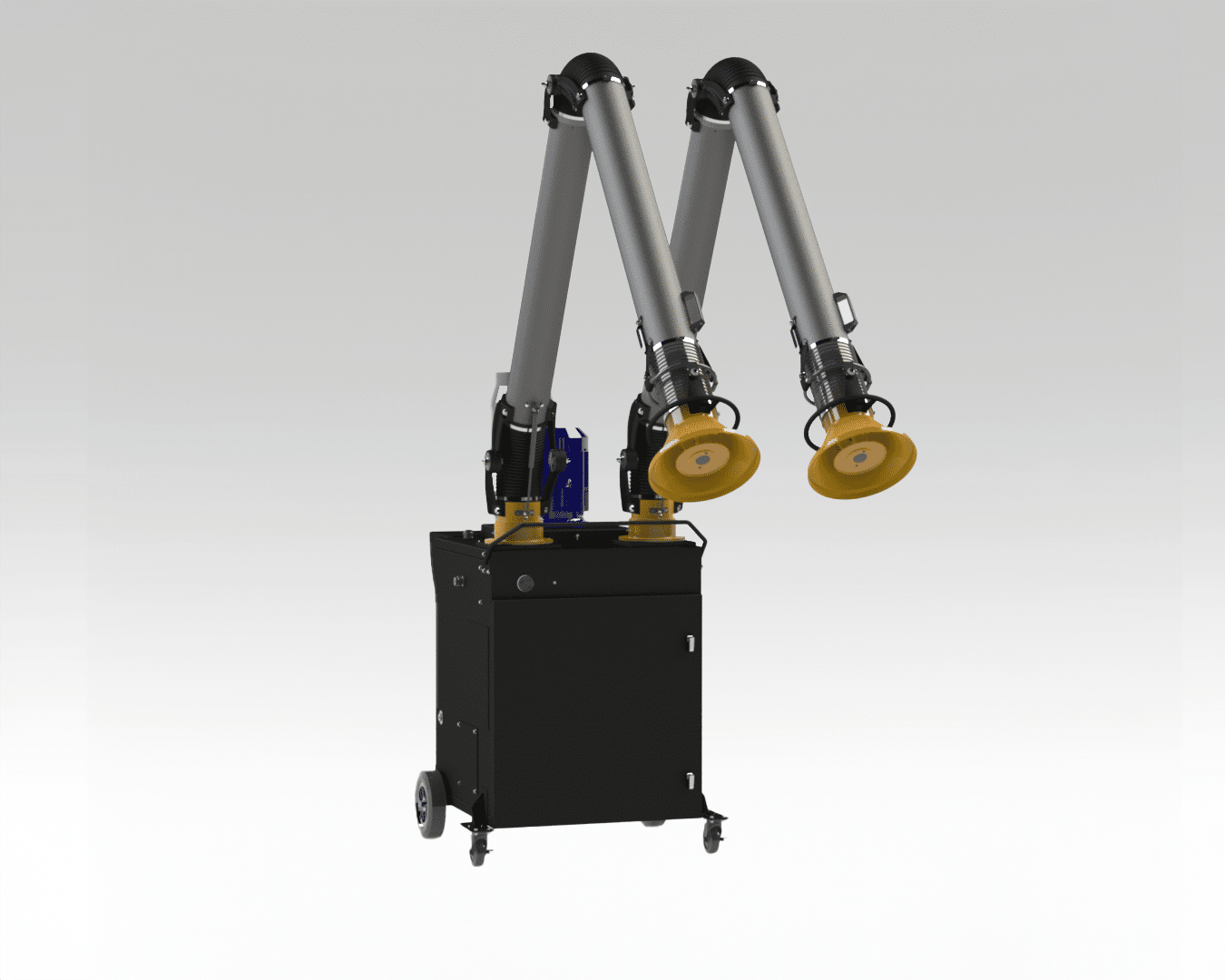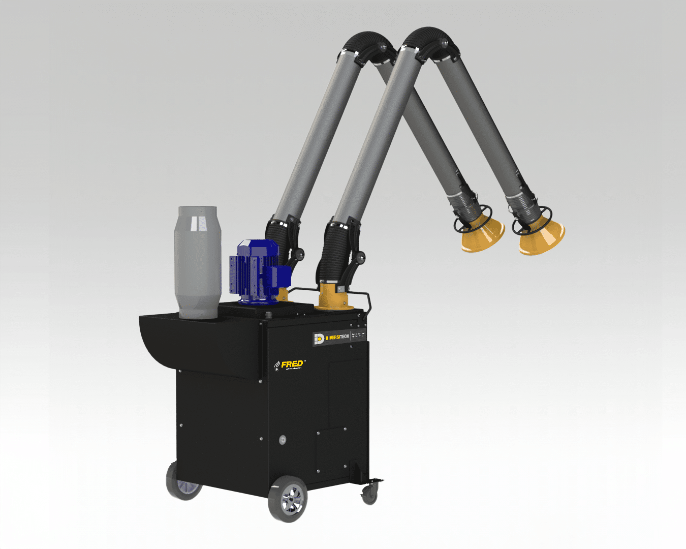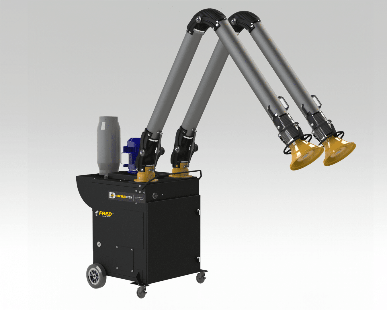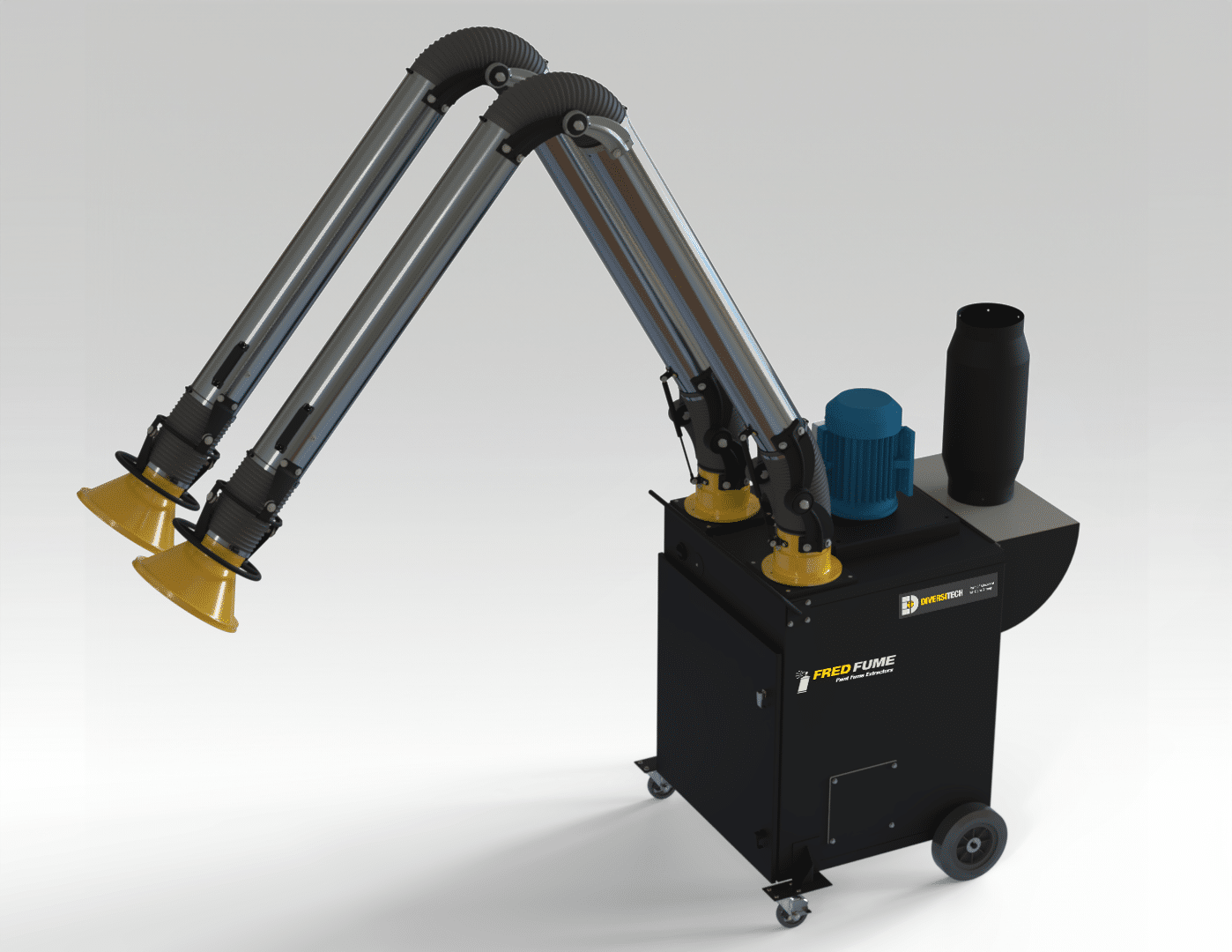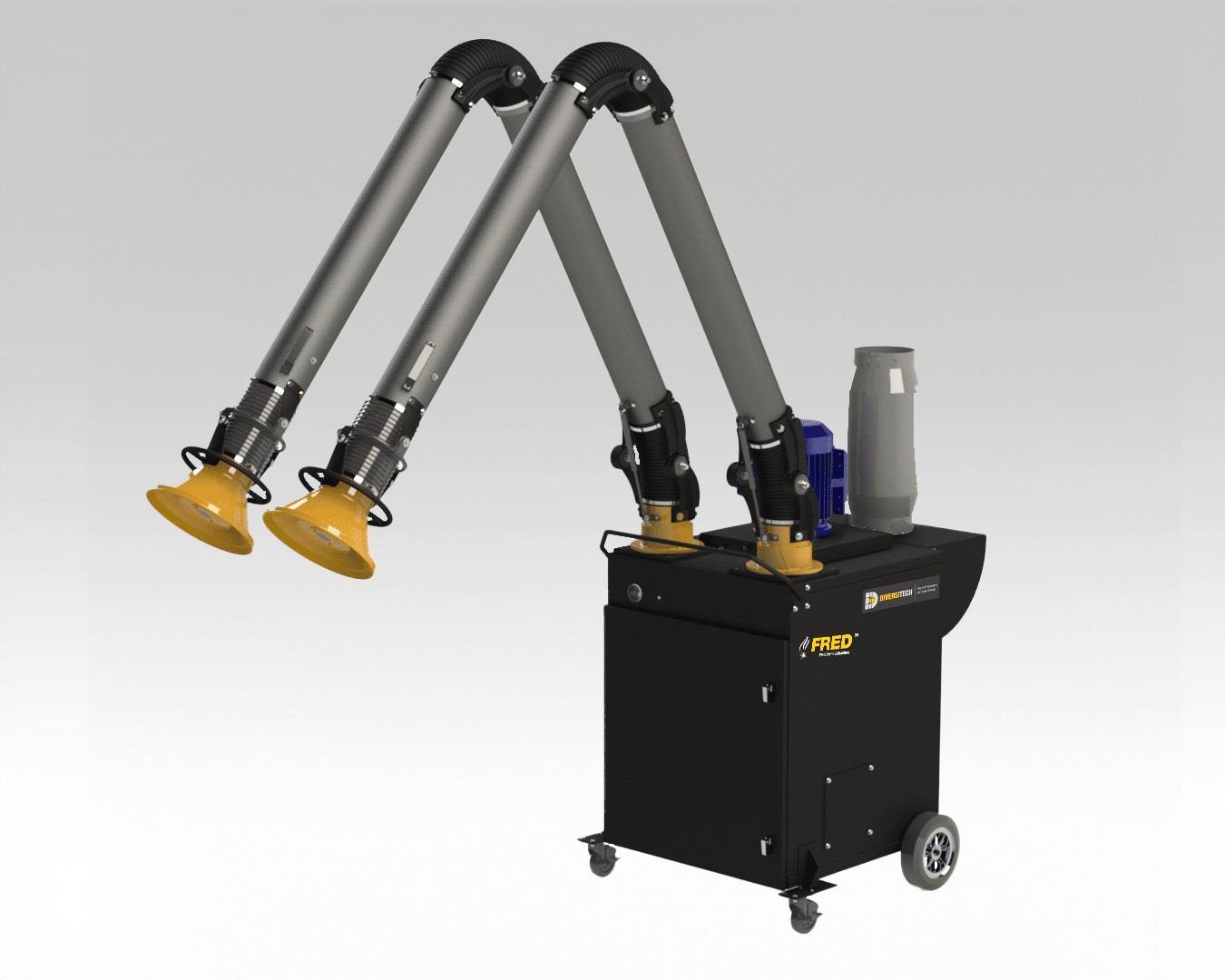 The FRED Sr. II Dual-Arm Portable Fume Extractor base model comes equipped with a 230V, 5.0 HP motor and dual, 10’ externally articulated capture arms, but the following options are also available upon request: