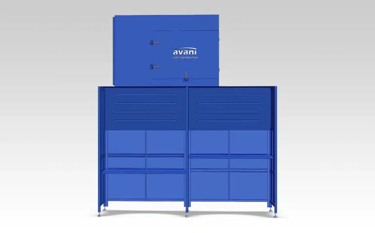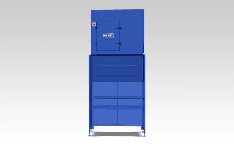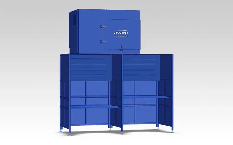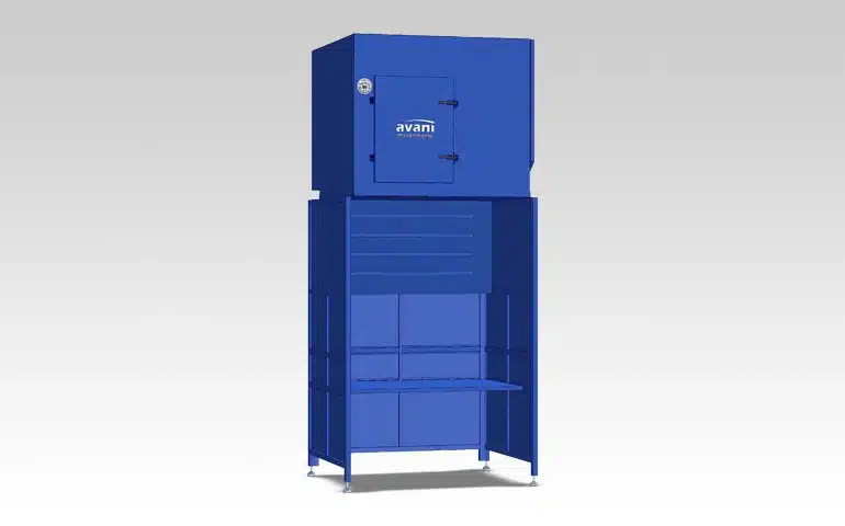 The WB-3500 welding booth is constructed of heavy (12 gauge) dual panel walls with both updraft and back-draft. Vacuum flow can be sourced from a stand alone filtered collector or a top mounted collector integral to the booth(s). This booth is available in both single or dual configuration and comes standard with overhead explosion proof lighting and debris clean-out drawers. This is Avani’s only “stand in front” booth with an optional fully enclosed wrap-around curtain.